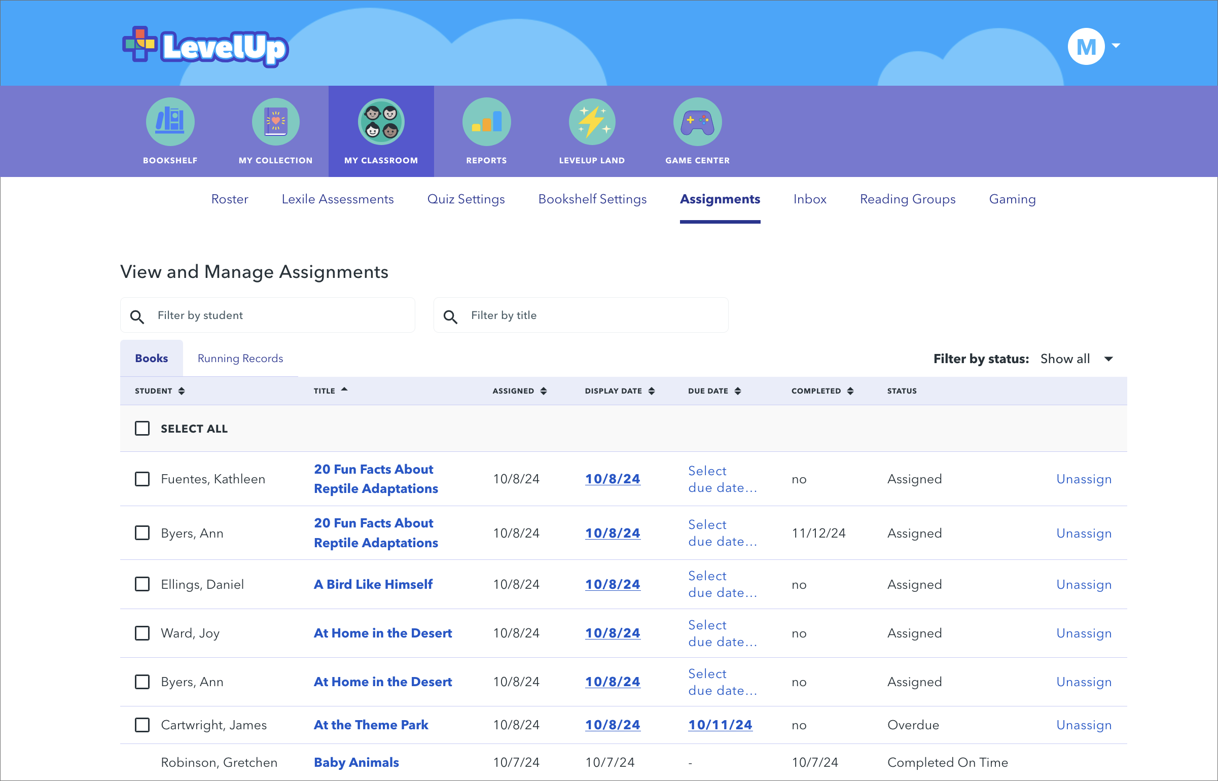The Assignments page lets you manage every book and running record that you have assigned to your students. Clicking the column headings in the list allows you to sort assignments by student, title, or date (assigned, display, due, or completed). You can also filter the list by typing a student name or book title in the fields in the upper left above the assignments list.
