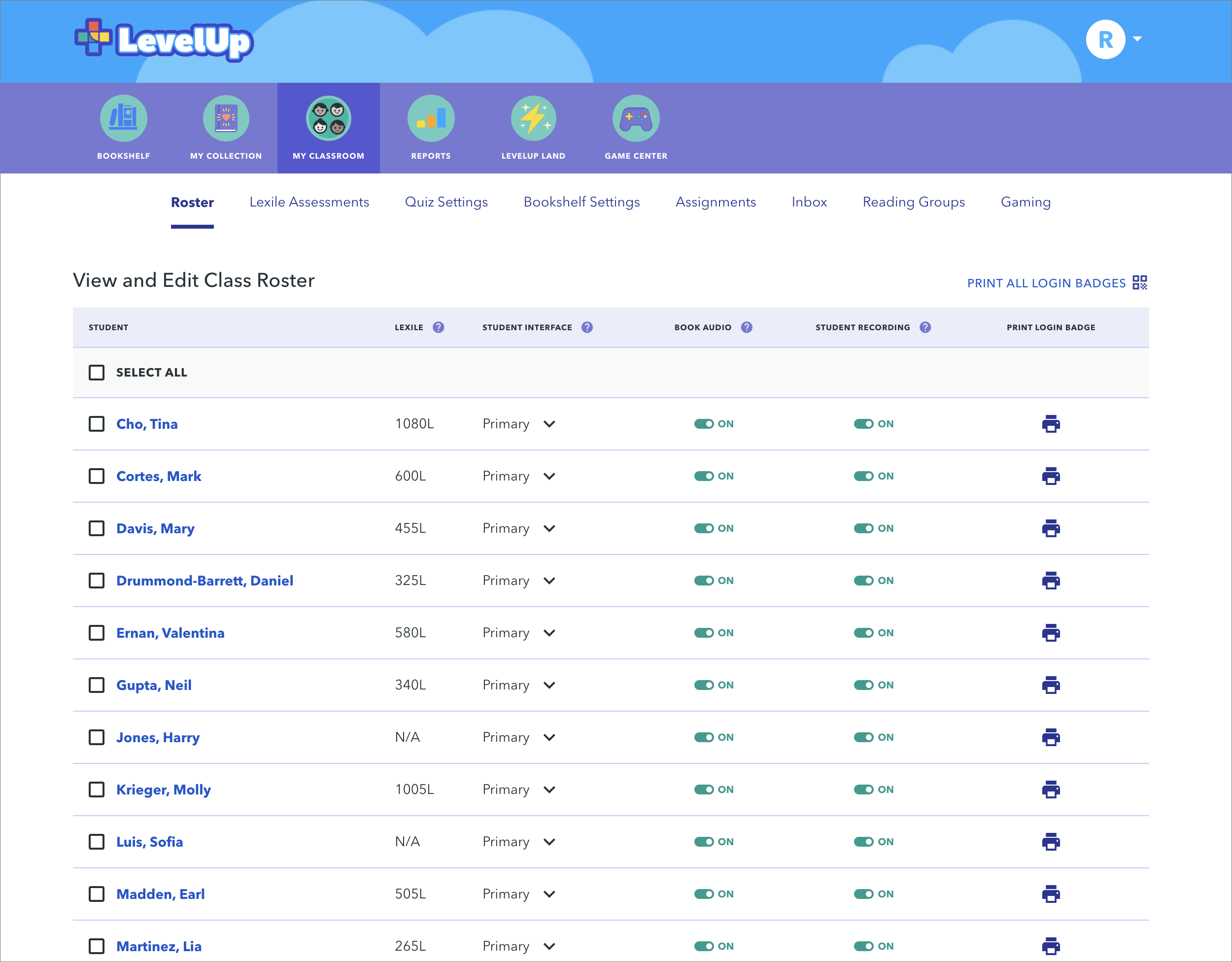 Your roster lists all students in your class along with their current Lexile reading measures.