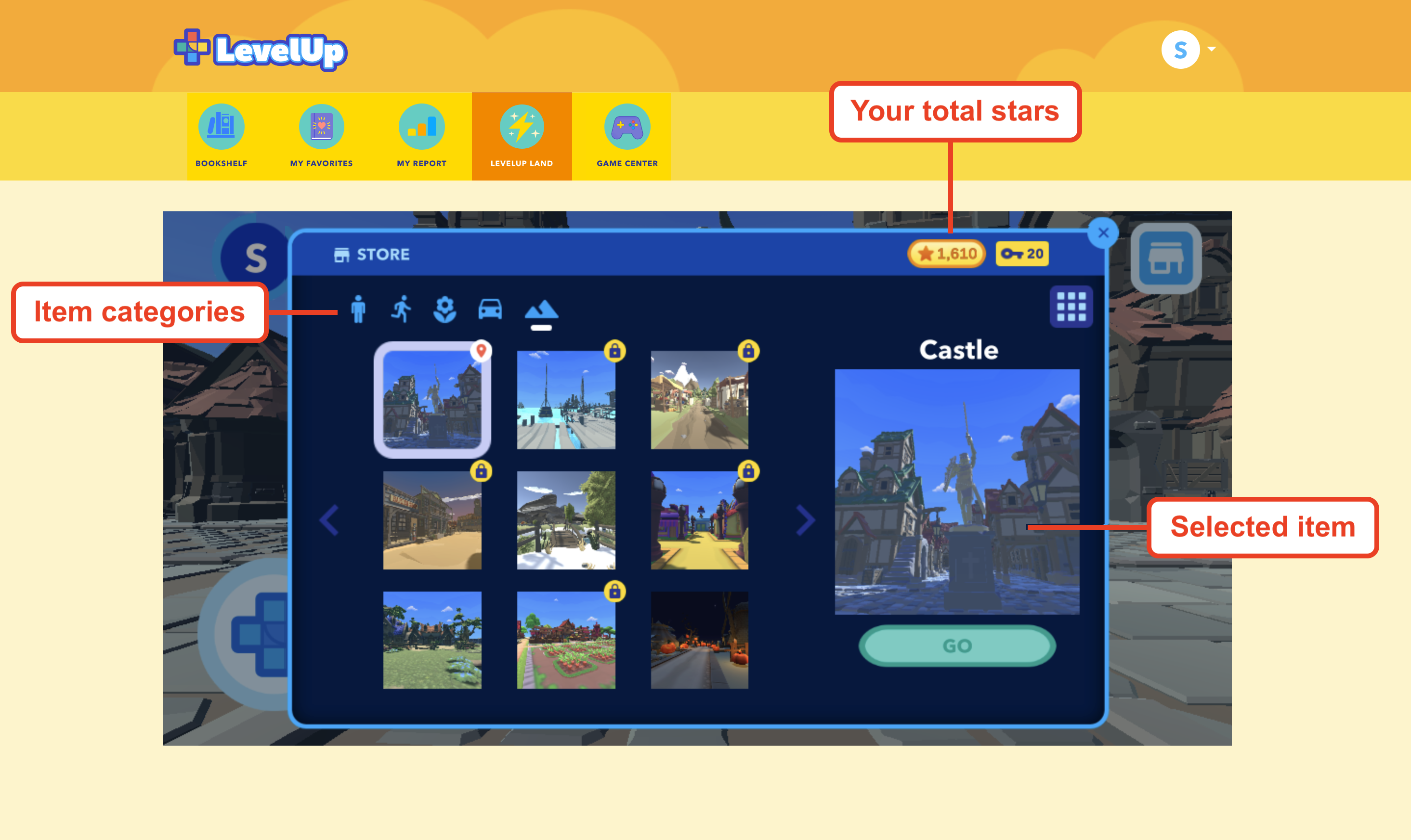 You can open the LevelUp Land store by clicking the icon in the upper-right corner of the scene. The store is filled with different animals, vehicles, and items that you can purchase with the stars you’ve earned from reading books and taking quizzes. Most of the items in the store cost between 10 and 80 stars, but some are more expensive.