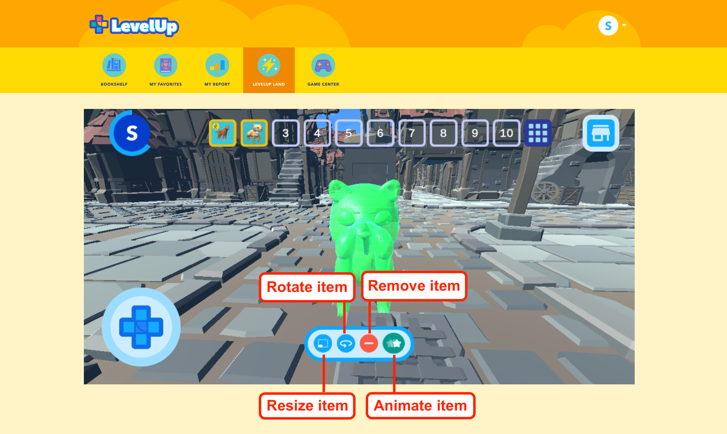 Every time you come back to LevelUp Land after a session ends it looks the way you left it, so there’s no need to save before closing! If you want to return to your bookshelf at any time during play, just click the bookshelf icon above your LevelUp Land scene.