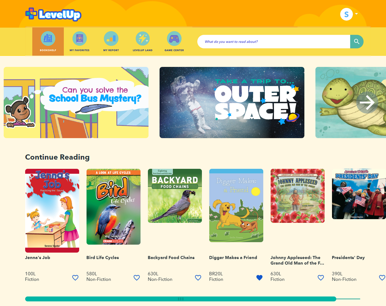 There are over 3,800 books on LevelUp Reader, but don’t feel overwhelmed. The books on your bookshelf have been sorted into different categories, such as “Arts and Crafts,” ”Science,” ”Sports and Fun,” “Civics and My Community,” and others to help you find one that you want to read.