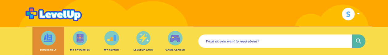 The personalized bookshelf is your LevelUp Reader homepage. From now on, every time you log in to LevelUp Reader you are taken to this page. The icons at the top of this page make up the LevelUp Reader toolbar. This is also where you can search for books by title or topic: